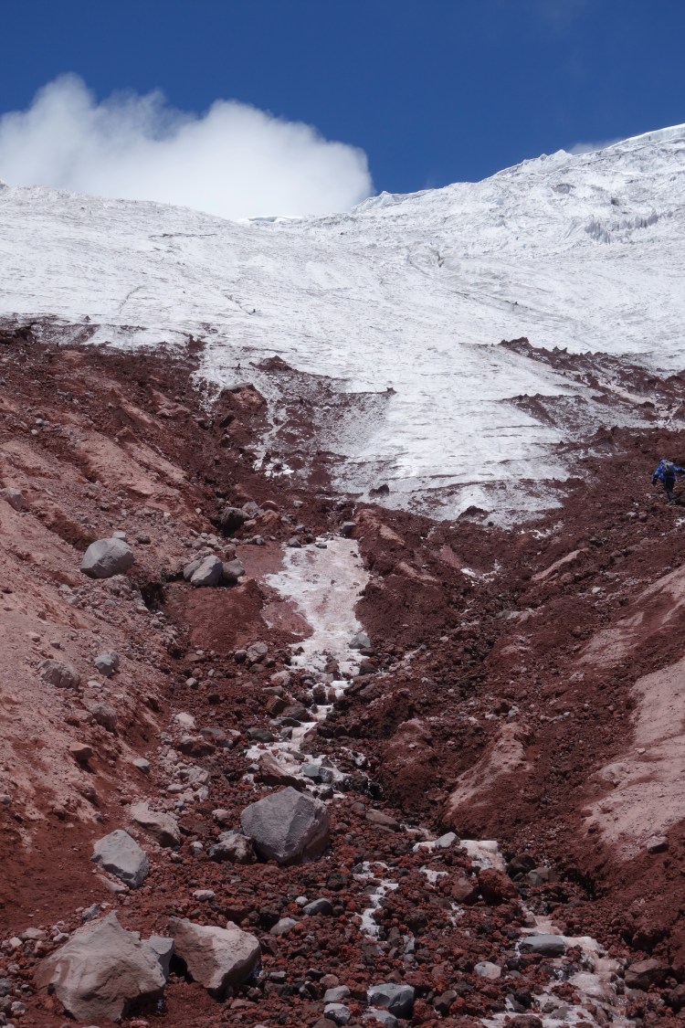 Upon reaching the edge of the ice, the summit came into full view. The thick snow mushroom created a wondrous contrast against the red, grey and brown soils that comprised the slopes of the volcano. The mountain air, albeit thin, was refreshing and empowering. As I made my way down the side of Cotopaxi, I was revelling in the extra oxygen reaching my lungs and brain, awestruck by the landscape below that was now almost completely clear of cloud.