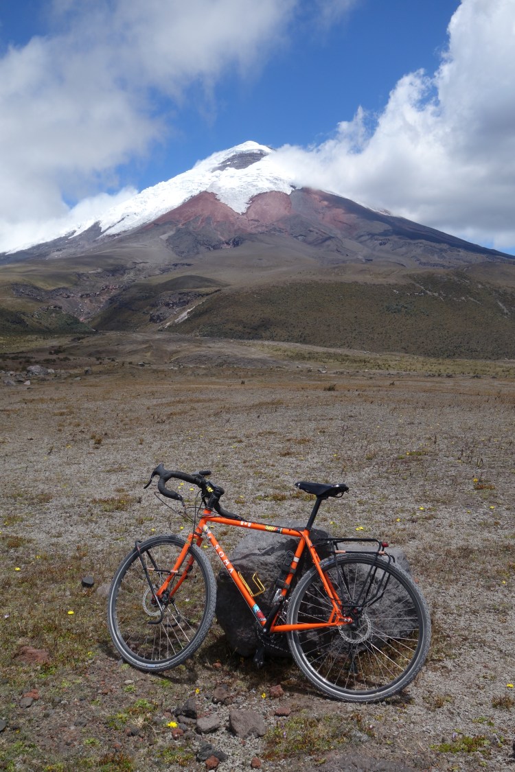 I ended up staying at the Rondador for two nights. During the middle day, I was able to put my bike in the back of a passing Ute, and score a lift into the national park, where I was dropped at the base of the volcano. The wind above the tree line made it difficult to swing open the door of the Ute. I left the car park and began the ascent to the climbers’ refugio; a lodge which acts as base camp for those beginning their midnight ascent to the summit of the 5897m volcano. With the campsite at the Rondador being my highest elevation of the trip to date (3150m), the walk up the slopes of volcanic sand and rock felt as though I’d recently donated a lung. The wind only increased in ferocity as I climbed higher, often resulting in a stumble backwards as I lost precious metres of progress. However, any frustration that began to seep into my thoughts was blown away on the wind as Cotopaxi began to reveal its snow covered summit. As the sky cleared, it became difficult to tell where the clouds ended and the glaciers started as they flowed down from the conical peak. Stretching towards to sky, it was easy to see why Volcan Cotopaxi is known at the ‘neck of the moon’.