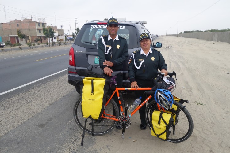 Within minutes of passing the city limits of Chimbote, I heard the familiar sound of a police siren. I’ve come to realise that this is no cause for concern in South America, as it is common for people to install car horns that replicate the sound of emergency response vehicles. However, this time the vehicle responsible for the sound, raced paced me, adorned in official insignia indicating that this was in fact the ‘Policia’. As quickly as it overtook me, the car pulled off the road and hit the brakes, disappearing in a cloud of dust and authority. When the wind cleared the scene, I was greeted by two officials, in neatly pressed uniforms, waving me off the road. The proceedings were very regimented. They asked to see my passport and took photos of my various other forms of documentation. Once this process was complete, it was as though a switch was flicked. Almost instantly, they regressed from their professional duties and their faces cracked into warm smiles. They were intrigued to know more about my route and did their best to fill the memory on their mobile phones with various photographic combinations; me with each of them, me with just my bike, me with their police car, my bike next to their car, just their car (not sure what this one was about?)…before they left, I turned the camera on them. As they got in their car, they double checked that I didn’t require a police escort for the remainder of the day’s ride.