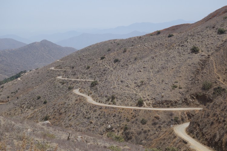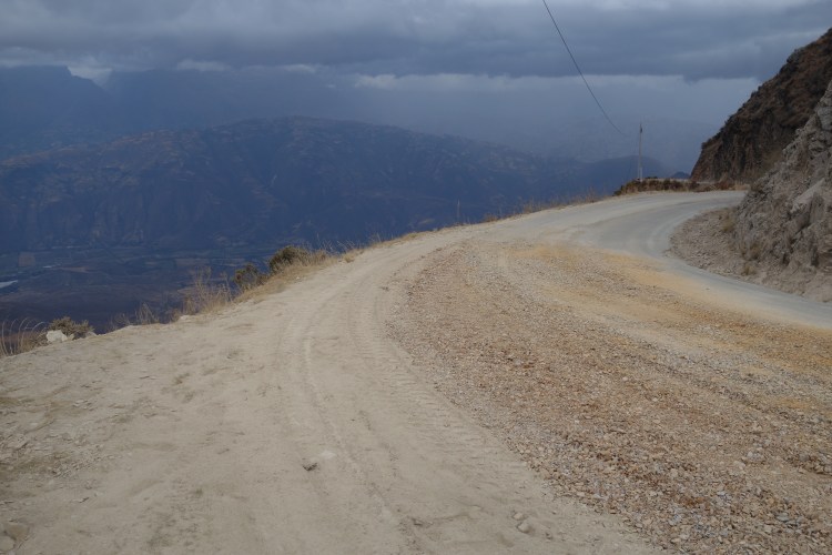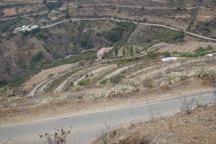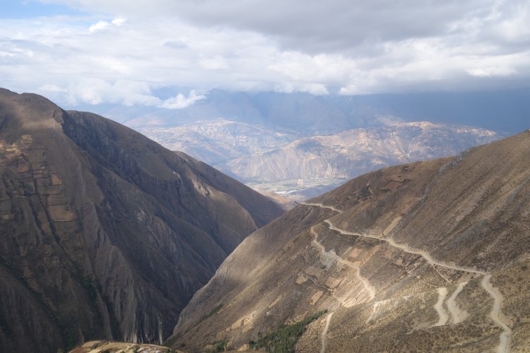 As soon as I began down the other side, I passed a turnoff to a mine. The road on this side of the pass clearly sees a lot of heavy traffic as the road was in atrocious condition. Each of the steep hairpin bends was covered in deep, soft sand, requiring motocross skills as I placed my inside foot on the ground guiding the bike safely around each corner. The straight sections of road were coated in a thick orange clay. Despite the testing conditions, it required all of my energy to keep my eyes on the road and refrain from getting absorbed in the landscape below. The gradient of the hillside was so steep that the switchbacks below appeared like a vertigo inducing staircase, where your feet are longer than the stairs are wide. On the adjacent side of the valley was a steep, shard-like face of rock and, what appeared from where I was, a near vertical grassy slope. Beyond comprehension, the green hillside was into crops.