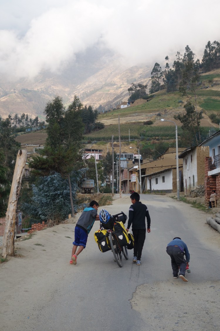 The final few kilometres to Pamparomas involved of a series of switchbacks. Looking towards the coast, the afternoon sky began to transitioned to the twilight hue of lavender. Rows of silhouetted ridge lines indicated how far inland I had ridden. I rounded the final bend for the day, presented with a view of the town, tucked into the hillside and drenched in the afternoon sun. I was stopped on the edge of town by three young boys who wanted to know what purpose each component on my bike served. Once the demonstration had finished, they asked where I was staying. I pulled out the now scrunched piece of paper from the hotel owner in Moro, and handed it over them. Resounding ‘ahhhs’ suggested they knew where it was. The two eldest boys moved in on either side of my bike, prying it from my grip and demanding that they lead me to my accommodation. I felt slightly self conscious as I walked behind them through the centre of town under the watchful eye of locals, but again, the hospitality of the mountains was proving to be unforgettable.