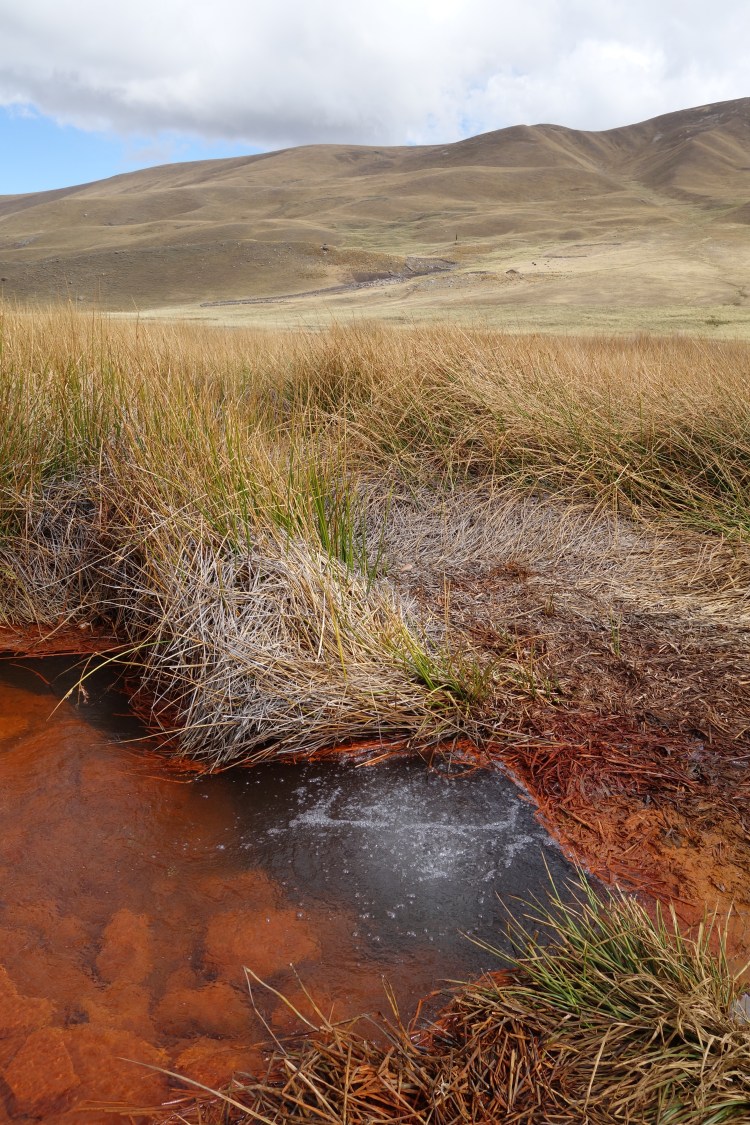 I’m sure the road surface was exactly the same as the day before, but a night under the stars had reenergised me, as I spent the morning floating over the corrugations. For the first hour, the gradient was kind, with the road skirting the expansive valley floor as the adjacent mountains continued to increase in grandeur. Cattle farmers could be spotted amongst their herds within the tussocks that covered the flood plains. At one point, the road passed a bubbling spring which marked the outflow for gasified water that had made its way to the surface from its origins deep beneath the surface.