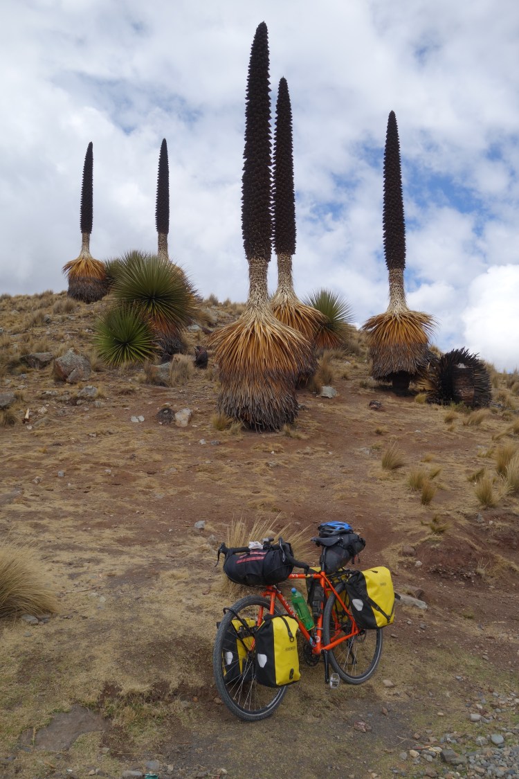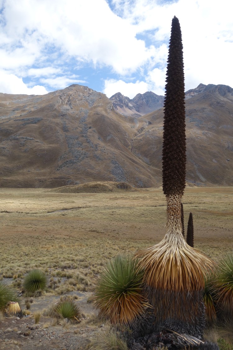 Whilst looming peaks never fail to inspire, the most alluring and intriguing features along this road were the tall, black figures that were dotted across the hillsides. Standing up to 15 metres in height with an almost ghoulish presence, Puya raimondii, or the ‘Queen of the Andes’, is the largest member of the bromeliad family (the same as the pineapple). The species is native to the rocky slopes of the Peruvian and Bolivian Andes, between the elevations of 3000 and 4800 metres. Despite the fact that each plant can produce between 8000-20000 flowers during an annual three month period, and that their reproduction cycle is known to last for up to 80 years, Puya raimondii is classified as an endangered species. This status is due to the immense threats to its survival posed by human causes fires, decreasing genetic variation, and climate change.
