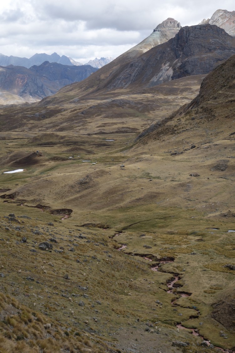 The persistent snowfall was soon reduced to occasional flurries. Not long after that, the sun was out again. Over the course of the morning, I had been passed by several minivans and tourist busses on their way from Huaraz to the glacier. However, once I rejoined the main highway and continued heading east, I found myself entirely alone on the road. Furthermore, this stretch of afternoon riding turned out to be the most spectacular of the entire highway. The narrow, derelict road wound its way up hillsides, underneath hanging glaciers, between countless alpine tarns and over streams that ranged in colour from turquoise to terracotta.