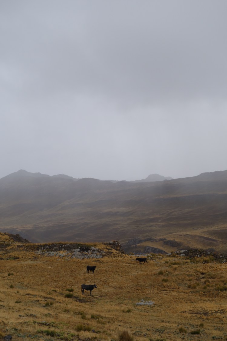 When I eventually reached the bottom of the valley, the light had faded and the rain had eased. The distant sky was glowing pink in the aftermath of the downpour. 20km had well and truly passed beneath my tyres when I arrived at a fork in the road. I pulled up beside a lone man on the corner who’s poncho was pulled well over his eyes and his jeans tucked into his gumboots. I asked him which direction it was to Huallanca; my desired location for the evening. He looked up from under his woollen shelter and simply pointed back up from where I’d come.