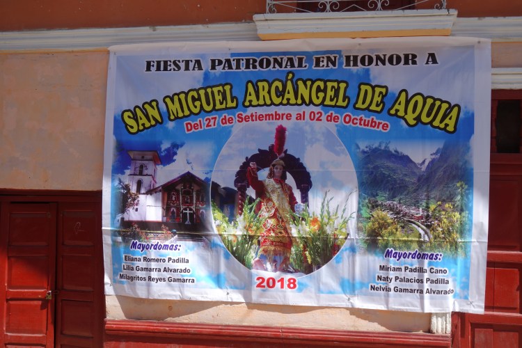 After 100km in the saddle and a climb to almost 5000m, Mickey was looking like a very attractive option for the night. Alas, I had a brief, cold shower, and rejoined the girls at the front of their house. As we walked towards the town centre, I learnt that tonight was the first night of a seven day, annual festival that takes place in Aquia. I later worked out that the fiesta was in honour of Aquia’s archangel, San Miguel. The two girls who’s home I was staying were overexcited about the evening’s festivities, whilst the other three, who were their cousins visiting from Lima for the fiesta, were a little more reserved.