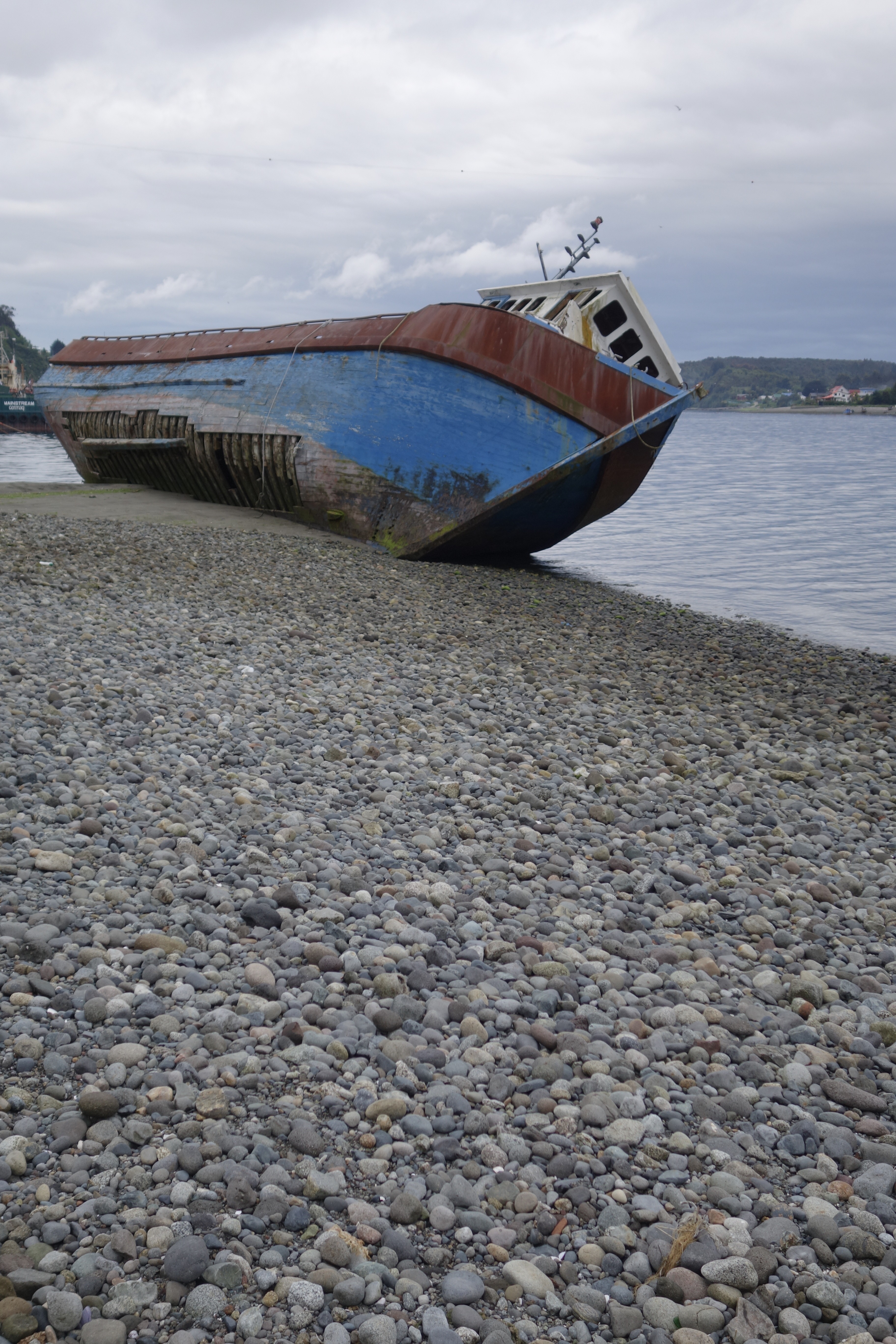 The further I rode, the more industrial the area appeared. Dilapidated, weatherboard huts lined the road, some of which appeared to be homes and others either abandoned or being used for storing old fishing nets. Many of these structures were painted in bright pastels with the intent to inject some vibrancy into the region. In stark contrast, decaying skeletons of ships lay on their side at the high tide line reflecting the unforgiving climate of southern Chile.