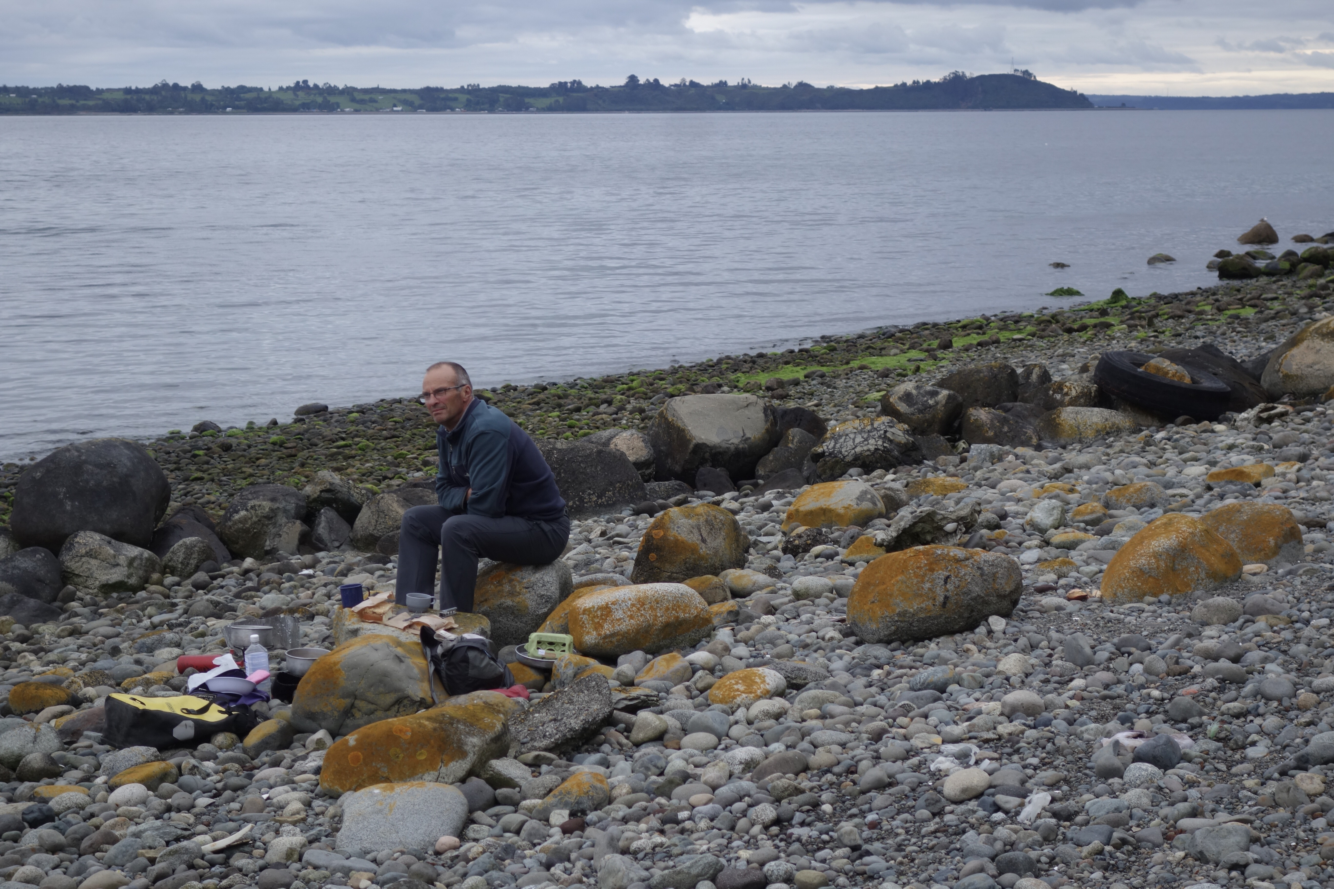 Our last dinner in Puerto Montt came from ‘Shimanji’; a tiny ramen restaurant on the edge of town run by an Okinawan man with very little Spanish. It was about as authentic as Japanese food gets in southern Chile and was the perfect meal for a drizzly evening. It was also a Tuesday night which, coincidently, meant two-for-one at Shimanji! The rain had ceased by the time we left the restaurant. We made the most of the break in the weather, setting up the stove on the beach to boil some eggs for lunch the following day. Beside us lay the rusty, derelict hull of a fishing vessel from a bygone era. Further along the beach sat large white bags which were of great interest to the local gulls; we suspected they contained pellets intended for the salmon farms which dotted the harbour.
