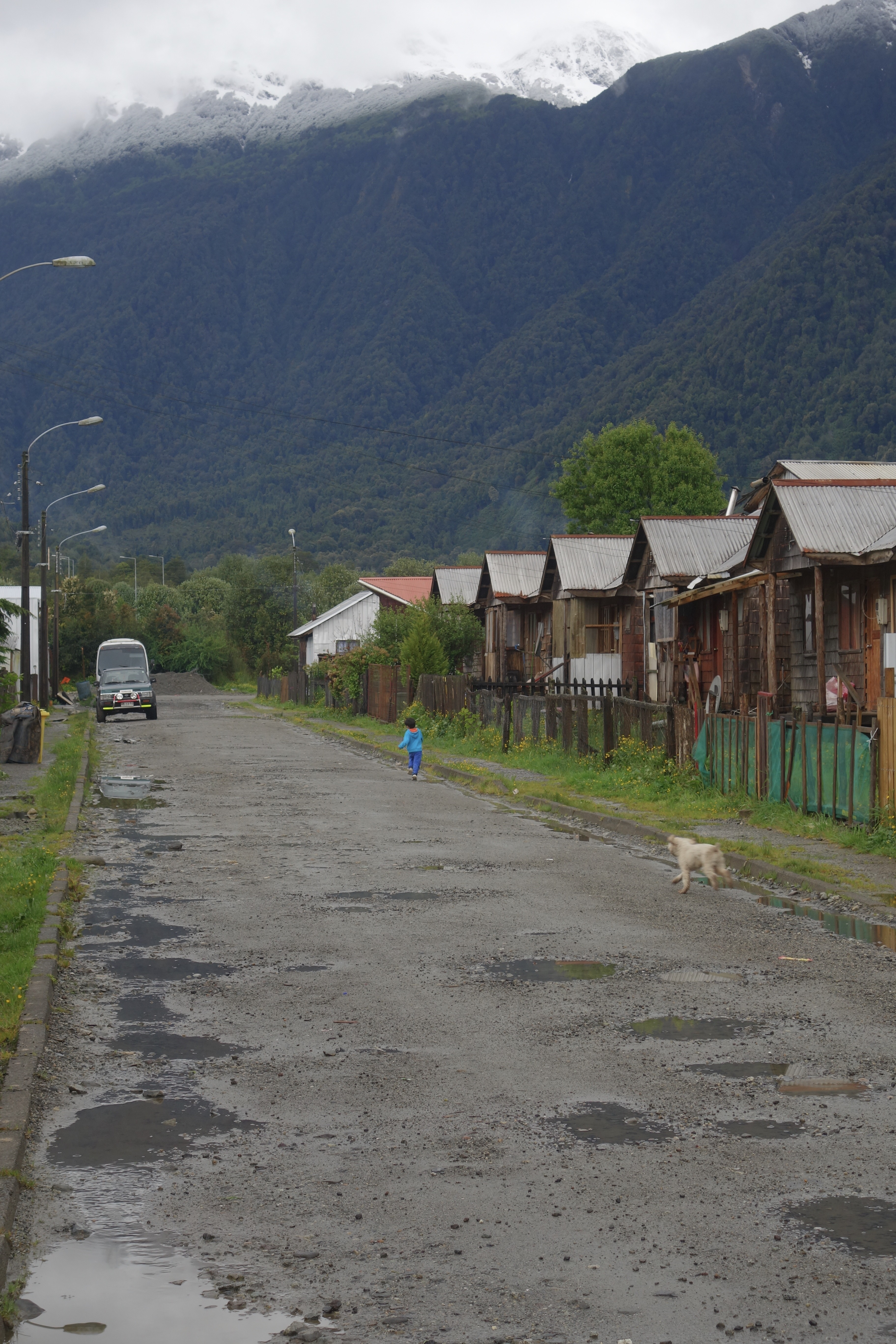The rain eventually eased enough for Dad and I to get out for a proper walk. We meandered along the foreshore, past neglected fishing boats, decaying timber homes and some miserable, soggy dogs. The contrast between old and new was evident; forsaken buildings beside imposing mobile phone towers. In the same way that weather events hampered the first homebuilding efforts of Uebel and Ludwig in the 1930s, I got the impression that the local climate has a severe impact on the lifespan of buildings in Puyuhuapi. There were, however, a few well-maintained timber churches in the unique Chiloé style; a legacy of the workers that helped colonise the town.