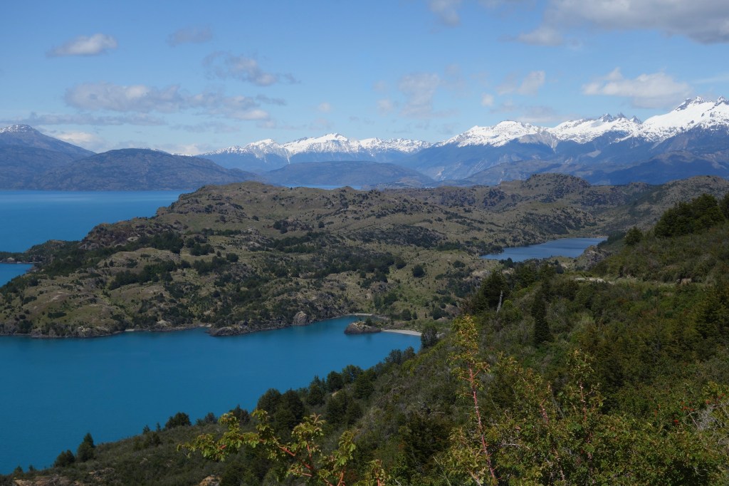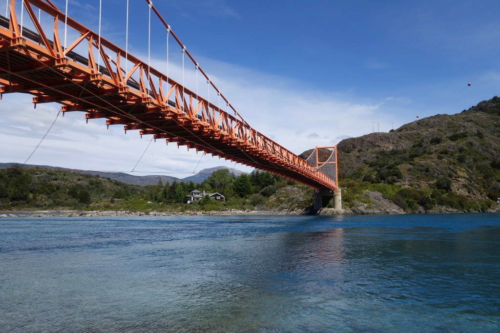 It was around 3pm when we came to a sizeable suspension bridge spanning what appeared to be a large river. Whilst technically it was a river, the map showed it to be at a short, narrow stretch of water between Lake General Carrera and the smaller Lake Bertrand to the west. The former must have been higher in elevation as a strong current pushed against the pylons of the bridge creating deep whirlpools in the clear blue water as it flooded from the larger lake. As we began crossing the bridge, we noticed a small, sun-soaked rocky beach below. We couldn’t resist the opportunity to have lunch in one of the most picturesque spots imaginable, quickly doubling back and finding a small dirt track down to the water. The hour we spent beneath the bridge was heavenly; fresh coffee, views of jagged, snow-capped mountain ranges, sunlight reflecting playfully off the turbulent, azure water, and hopeful trout throwing themselves at dragonflies that flew perilously close to the surface. We were giddy. I took the opportunity to have a brisk swim before we both fell asleep in the heat of the afternoon sun.