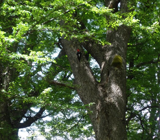 Later, we took a break beside a tannin-stained creek which cut a meandering path through the forest. Idle and quiet, it wasn’t long before the origin of the mysterious percussion was soon revealed. Startled again by the knocking, we looked above us to see a black bird with a crimson head clinging to the side of tree and repeatedly smashing its beak into the trunk. I’d never seen a woodpecker before, but there was no denying that’s what we’d been hearing for the last hour or so. I’d later read that this bird, the Magellanic Woodpecker, is the largest living species of the genus Campephilus. The bright red head indicated that this bird was a male, as the females are predominantly black all over. Fascinated, we watched on as the woodpecker slowly worked its way up the trunk of the tree, tapping as it went to identify any hollows or rotten timber where wood-boring grubs and beetles might reside. When reverberation indicated empty space, the bird would go to town on the tree, hammering with concussive ferocity until its beak penetrated the bark and it was hopefully able to extract some hidden protein. The process, repeated countless time, was captivating.