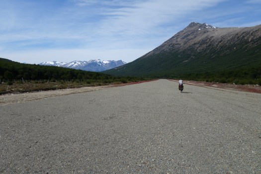 For the next 10 kilometres, the trail maintained a rideable gradient through a dense beech forest that reminded me of home. At one point, the vegetation gave way to a narrow clearing about 100 metres in length. The presence of a tattered windsock hanging from a rusting pole was the only evidence that this gravel strip was a remote runway. A lack of tire marks and a smattering of weeds suggested that it had been a long time since anything had landed. We lined up and had a sprint from one end to the other, revelling in the obscurity of racing each other on our bikes along a runway in the forest on the border of Chile and Argentina. With panniers loaded with gear and legs loaded with lactic, there was little to no chance we’d reach enough speed to take off.