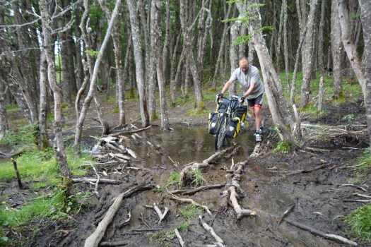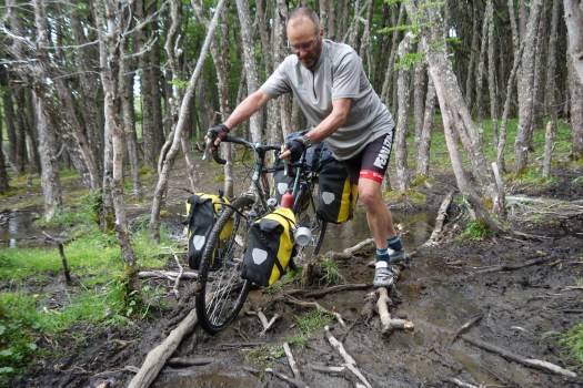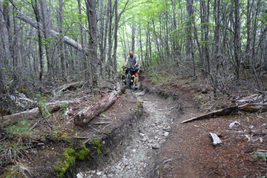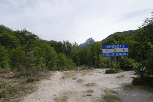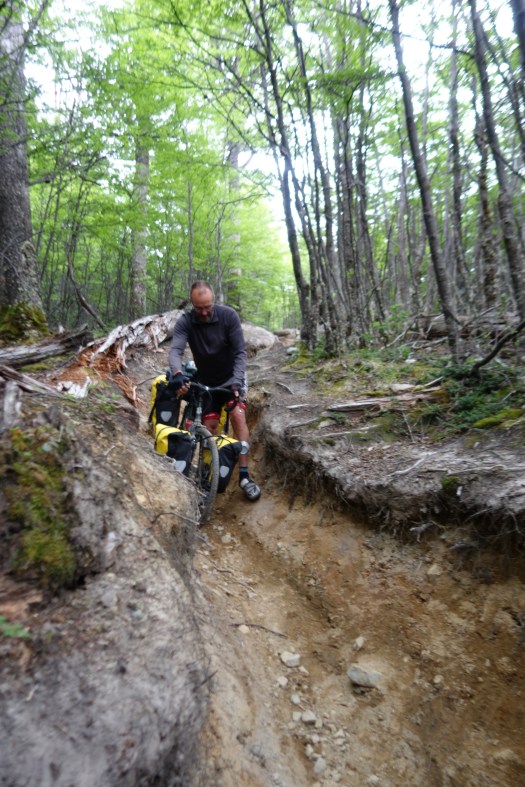 Figuring we should probably use our remaining energy to make it to Argentina, we left the landing strip and continued down the road. Within minutes, the well-formed trail through the forest turned abruptly to a rough walking track, barely wide enough for a bike. We soon came across a sign indicating that we had reached the official border. The dilapidated sign, coupled with an absence of infrastructure and officials, gave the border crossing a sense of illegitimacy. We knew this wasn’t the case, but we embraced the opportunity to feel like fugitives for a few moments. Sitting beside the sign, we ate lunch and pondered on what the remainder of the day would hold. It was well-documented that from the border the following six kilometres were unrideable. Despite this, we set off after lunch, confident that ‘surely’ we’d be able to roll slowly along the trail.
