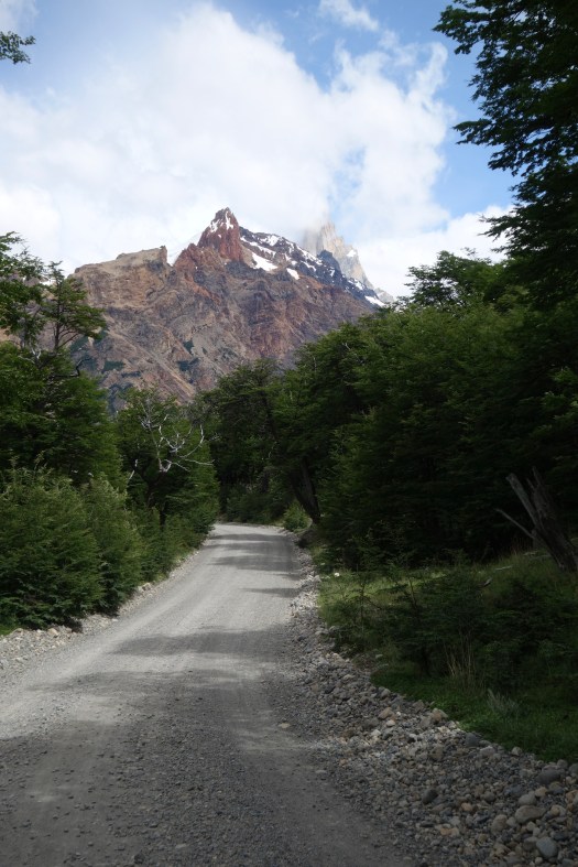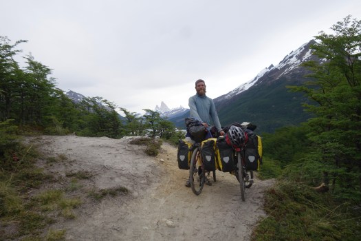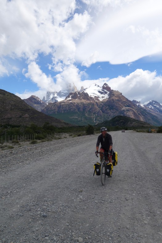 A less than nutritious lunch combined with a humbling headwind and bone-jarring corrugations made for a tough afternoon. Dad really struggled, voicing his opinion several times that this was the most difficult riding of the entire trip. The numbers said it all, with the final 30 kilometres taking almost three hours. We stopped briefly to chat to a fit and friendly Polish couple who were walking back to town after a few days out in the mountains. We made the most of a short rest and interesting conversation before continuing, grateful that we would be drinking a cold beer long before they arrived in town under the weight of their packs. The Las Vueltas River valley that we’d been following all afternoon gradually began to narrow as the hills closed in on either side. Seemingly out of thin air, we turned a corner to discover the town of El Chalten nested between cliffs on the opposing banks of the river. A main street dissected the town and any urban sprawl was strictly dictated by the geography. The sight and sensation of asphalt was indescribable. It was the silence beneath my tires that alerted me to the changed surface, prompting us to reflect on the last time we’d ridden on a sealed road. It was more than 500 kilometres ago.