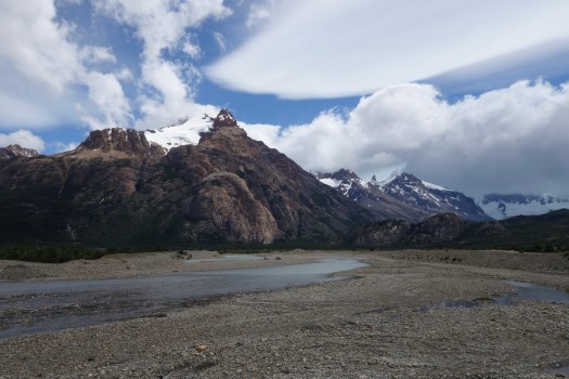 The first few kilometres provided superb riding. A smooth and meandering hard-packed dirt road guided us along the bank of a crystalline mountain stream. The fishing potential had me making mental notes, scheming my future return with rod and reel. Fine, feathery clouds danced between the granite peaks of the Fitzroy Massif, the grey, white, and gold tones of the alpine crown contrasting the emerald canopy below. At the bottom of the valley, we emerged from the forest and were greeted with expansive alluvial plains and a stiffening head wind. We took advantage of some remnant roadside shrubs and had lunch out of the wind. In dire need of restocking, we scraped the bottom of the panniers and indulged in some instant noodles, followed by a competitive round of pebble throwing.