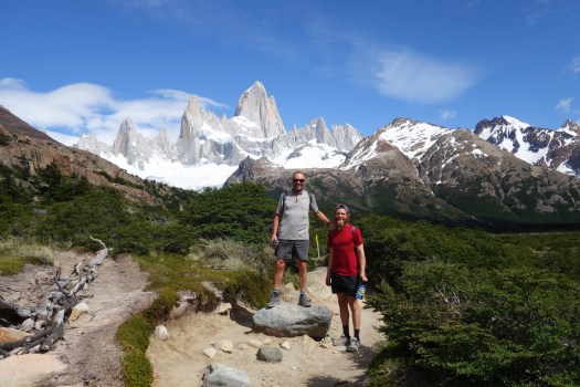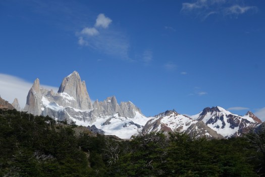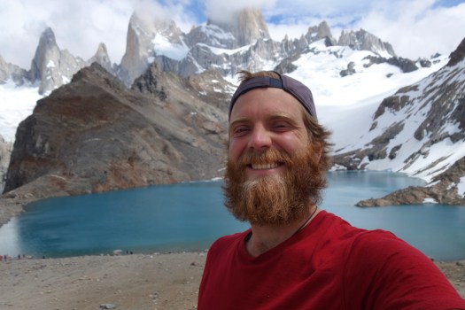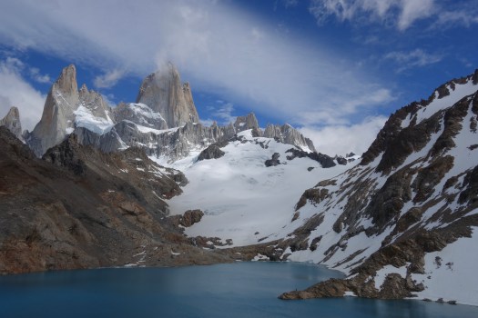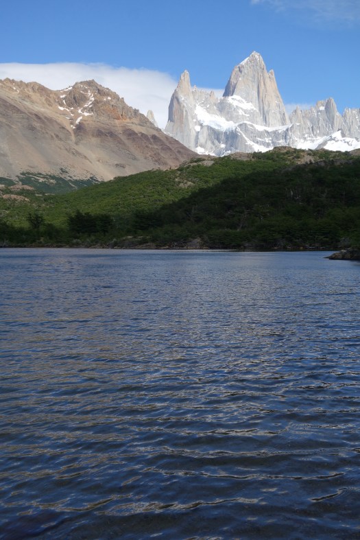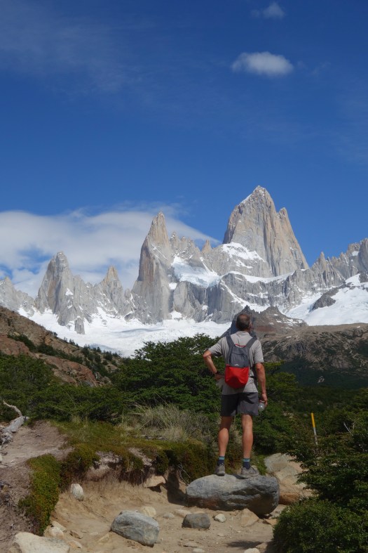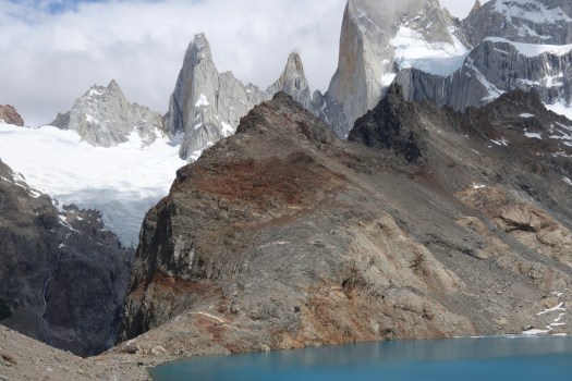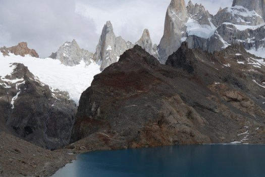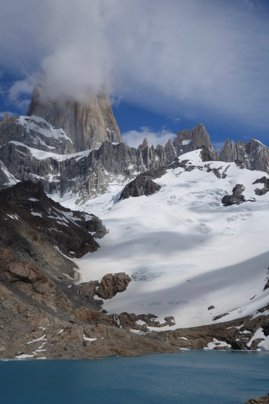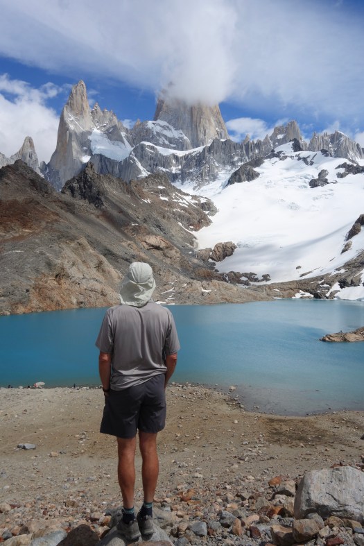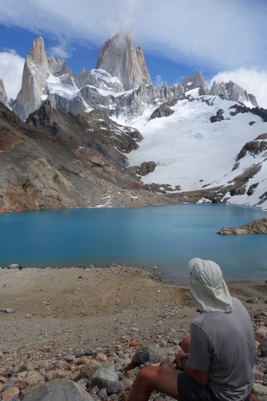 Despite a morning of some of the greatest views of my life, neither of us were really prepared for what lay over the final crest of the climb. The landscape dropped away at our feet as the hill we were standing on plunged down into the milky blue Lago De Los Tres. Large blocks of winter ice remained suspended in the frigid glacial water. The lake, however, was merely the garnish for the visual feast that loomed behind it. We were now face-to-face with the various peaks and spires that comprise the mighty Fitz Roy Massif; Guillaumet, Mermoz, Poincenot, and Saint-Exupery. At the centre of these mountains was Cerro Fitz Roy itself, reaching 3375m into a near-cloudless sky. It was remarkable. We sat behind a boulder, obscuring our view of other hikers to create the illusion of being alone with the mountains. It was another moment on the journey where I was so grateful to be sharing the experience with someone else, let alone with my dad.