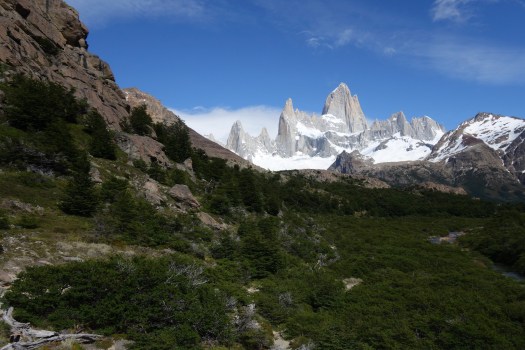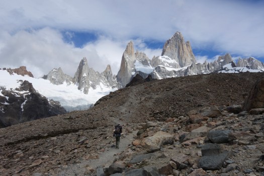 The trail eventually began to plateau, and we were able to get back in the saddle and begin making more encouraging progress. I was a few hundred metres ahead of Dad when I first laid eyes on the unmistakable granite towers of Cerro Fitz Roy. Across the valley stood a peak that I’ve ascended countless times in books and films alongside some of the world’s most notable alpinists. It was like meeting a hero.