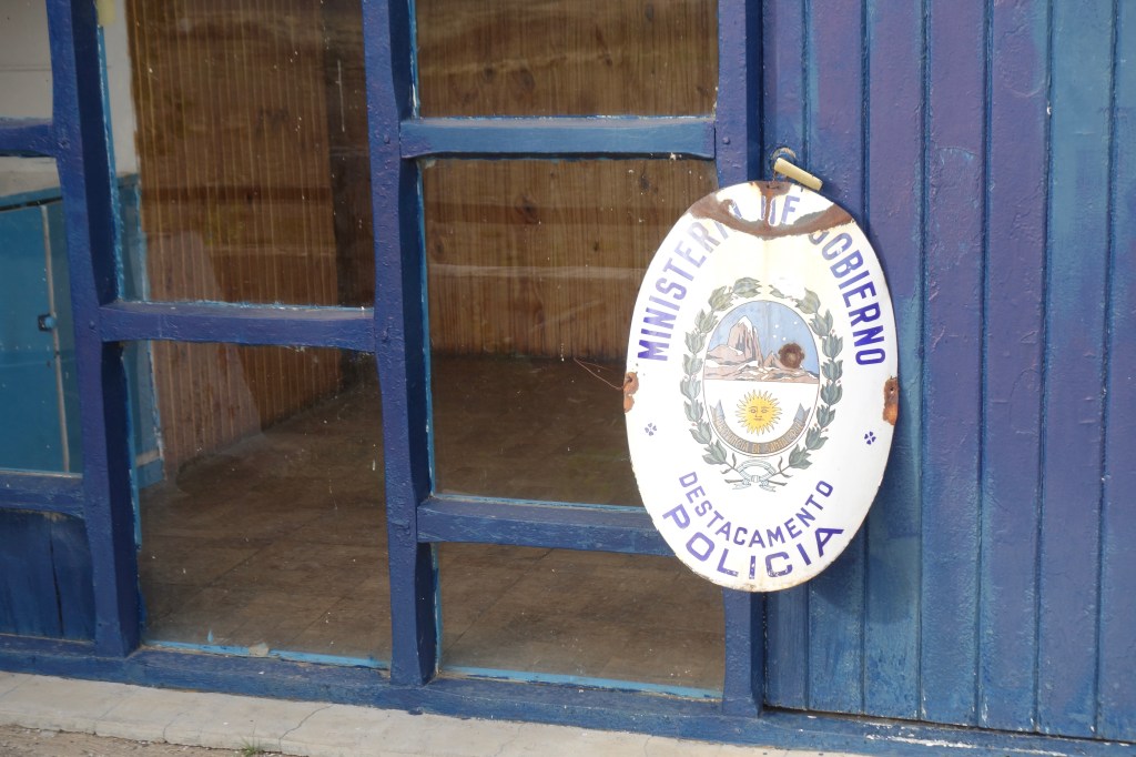 Gritting our teeth (not to the extent of Tyler Hamilton), we pushed hard for another two hours. Ears ringing from the wind, and our bodies shaken by the corrugated road, we arrived at the junction and took shelter in a petrol station. We refuelled with coke and chocolate while exploring the shop’s front window which was completely covered with stickers from passing travellers. Chatting to the lone man working at the shop, we mentioned how strong the wind had been out on the road. His response was emotionless and dismissive; ‘That’s Patagonia’. He told us that we should be able to stay in the place across the road next door to the new police station. We were uneasy about another night beside a police station, but the bare, wind-swept landscape provided limited options for a peaceful night in a tent.