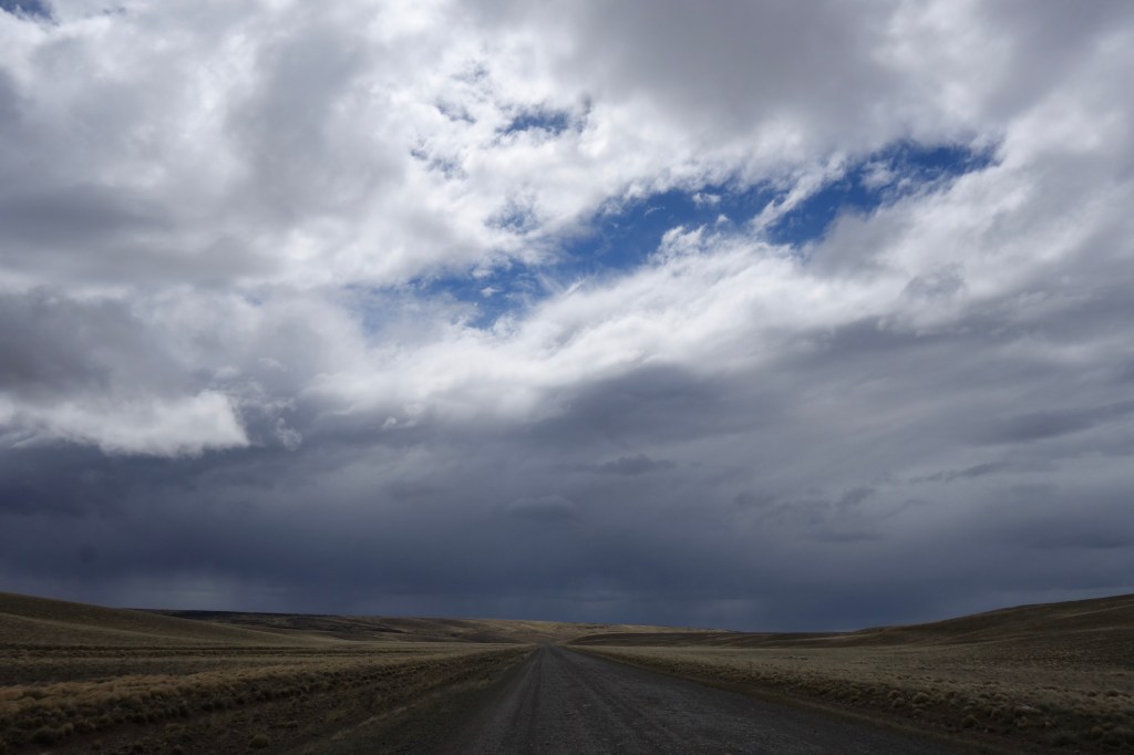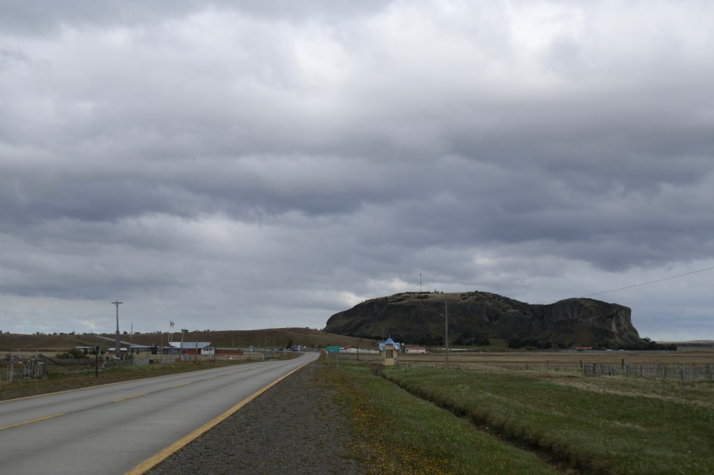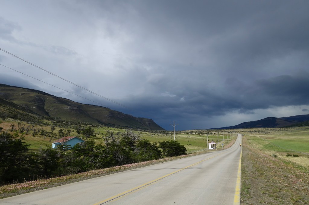 It was 11.30am when we began pedalling south. Still technically the morning, we counted it as a win. Some rolling hills and dense local traffic made for an unpleasant departure from the streets of Puerto Natales. Once we’d cleared the outer suburbs, however, the topography and the wind became much friendlier and we were ferried south on a stiff breeze. After an hour of pedalling, we stopped for a snack and to put on our jackets as the clouds darkened and the wind gained ferocity. The sky possessed a tangible energy. The road soon swung to the west which turned the tailwind into a menacing sidewind. With heavily loaded bikes, sidewinds demand greater bike control and even greater concentration. Conversation slowed as we rolled on through a barren landscape of estancias and grasslands.