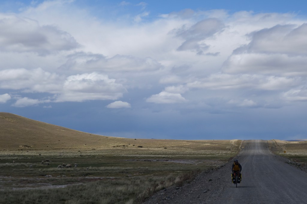 Dark, moisture-laden clouds were draped over the horizon in all directions. A small hole in this nimbostratus blanket allowed sunshine to light up the earthen palette of the surrounding pampa. The local fauna kept my destructive thoughts and the deteriorating road conditions from completely derailing the day. Guanaco and flamingos stood tall against the wind on their spindly legs, while birds of various sizes appeared suspended and motionless in the sky. The occasional South American Fox, or zorro in Spanish, was seen devouring decaying roadside carcasses. Their penetrating eyes would watch us until we’d completely passed by and could be eliminated as a threat to their meal. We rode past flocks of merino sheep with enviably weatherproof jackets. They scattered at the first sight and sound of us, the mothers leaving their long-tailed lambs to frantically chase after them.