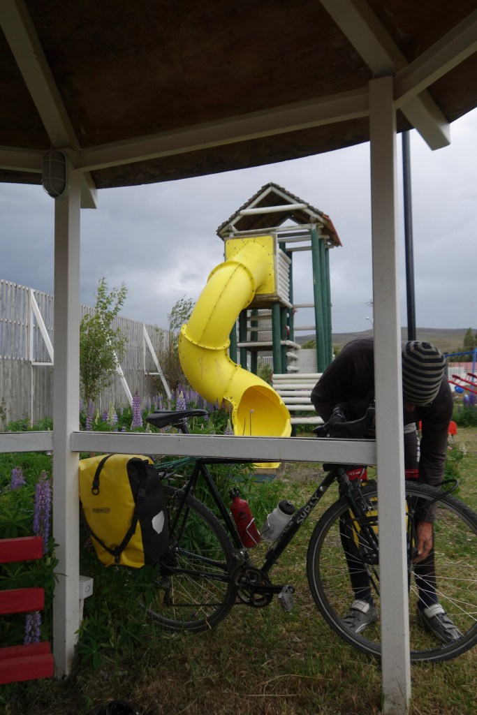 It was around 9pm by the time we’d finished dinner were getting ready to crawl into our sleeping bags. Sitting on the swings sipping the last of the red wine we’d lugged from El Calafate, a lone cyclist appeared on the far side of the park. As they got closer to where we were camped, they became more familiar. The child-sized bike, the white jacket, the red cheeks, and the foggy glasses. It was unmistakeably Maria, the tenacious German lady we’d met in the freezing rain that afternoon near Rio Cisnes on the Carretera Austral. The same Maria who we rendezvoused with on the Ferry from Villa O’Higgins, hearing how she’d been hit by a car and had her back wheel mangled.