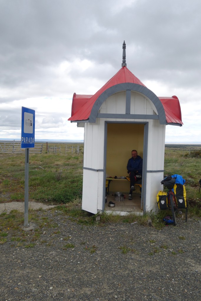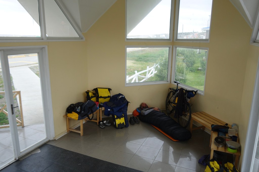 We persevered for another hour as the wind swung from the side to the front and back again. It was 8.30pm when we arrived on the outskirts of Villa Tehuelches; a small village of approximately 150 people that serves as the capital of the larger commune of Laguna Blanca. Steve had recommended that we stay here as it was the only place to find shelter and food on the final push to Punta Arenas. Specifically, he had told us to look out for a bus stop on the edge of town. Like most structures in this part of the world, over engineering and reinforcement against the elements takes priority in the design process. The bus stop was no exception. Steel framing, double glazed windows, and walls that felt a metre thick. It was a more of a bunker than a bus stop and more of a hotel room that the roadside squat we had envisioned. Given the abundance of bus stops along the road, we pondered the lack of busses. We hadn’t seen one in days, and even then, it had been a tour bus which wouldn’t be stopping to pick up locals. Despite this absence of busses and the consequent lack of passengers waiting in the bus stop, it still felt as though we should ask permission before rolling out our mats and claiming the shelter as ours for the night.